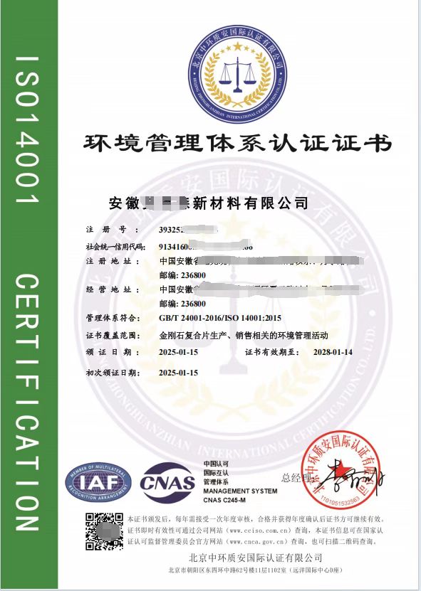 恭喜安徽艾克森新材料有限公司顺利通过体系审核,由国家认监委备案机构:北京中环质安国际认证有限公司颁发的ISO三体系认证证书顺利下证