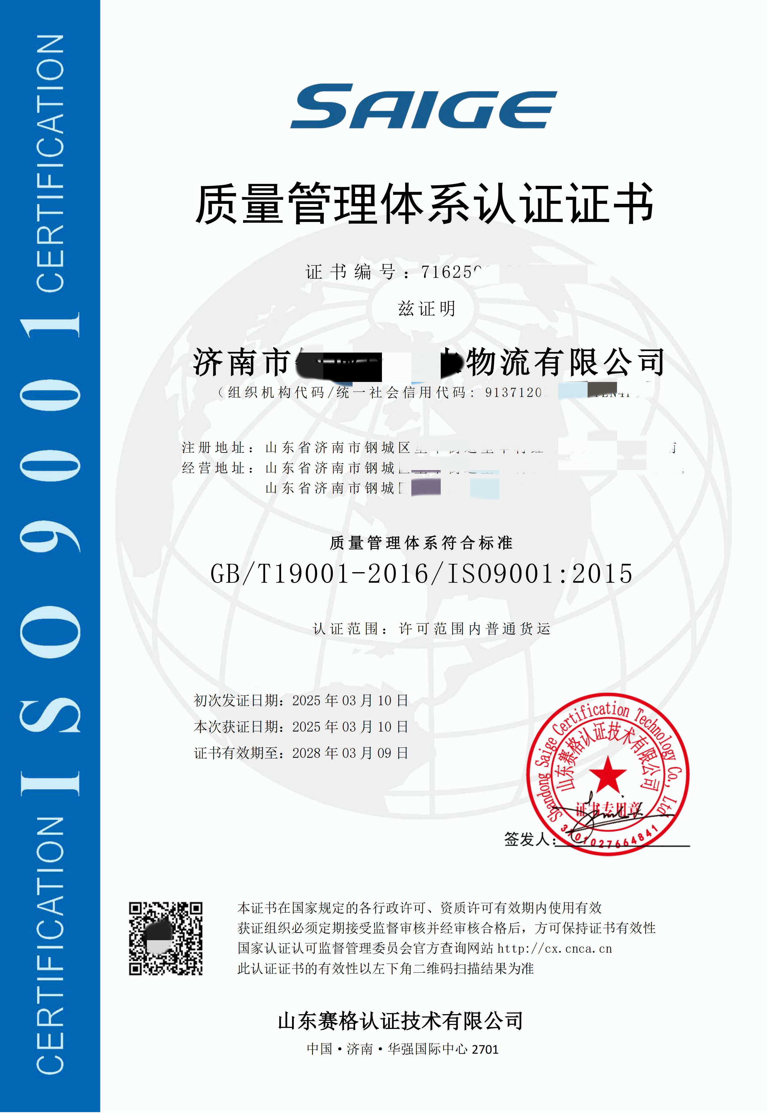 济南市钢城区山水物流有限公司司办理ISO9001体系认证证书/AAA信用等级证书/商标/软件著作权/实用新型专利/人员证书/行业资质证书/两化融合贯标等项目认证均可联系我司办理