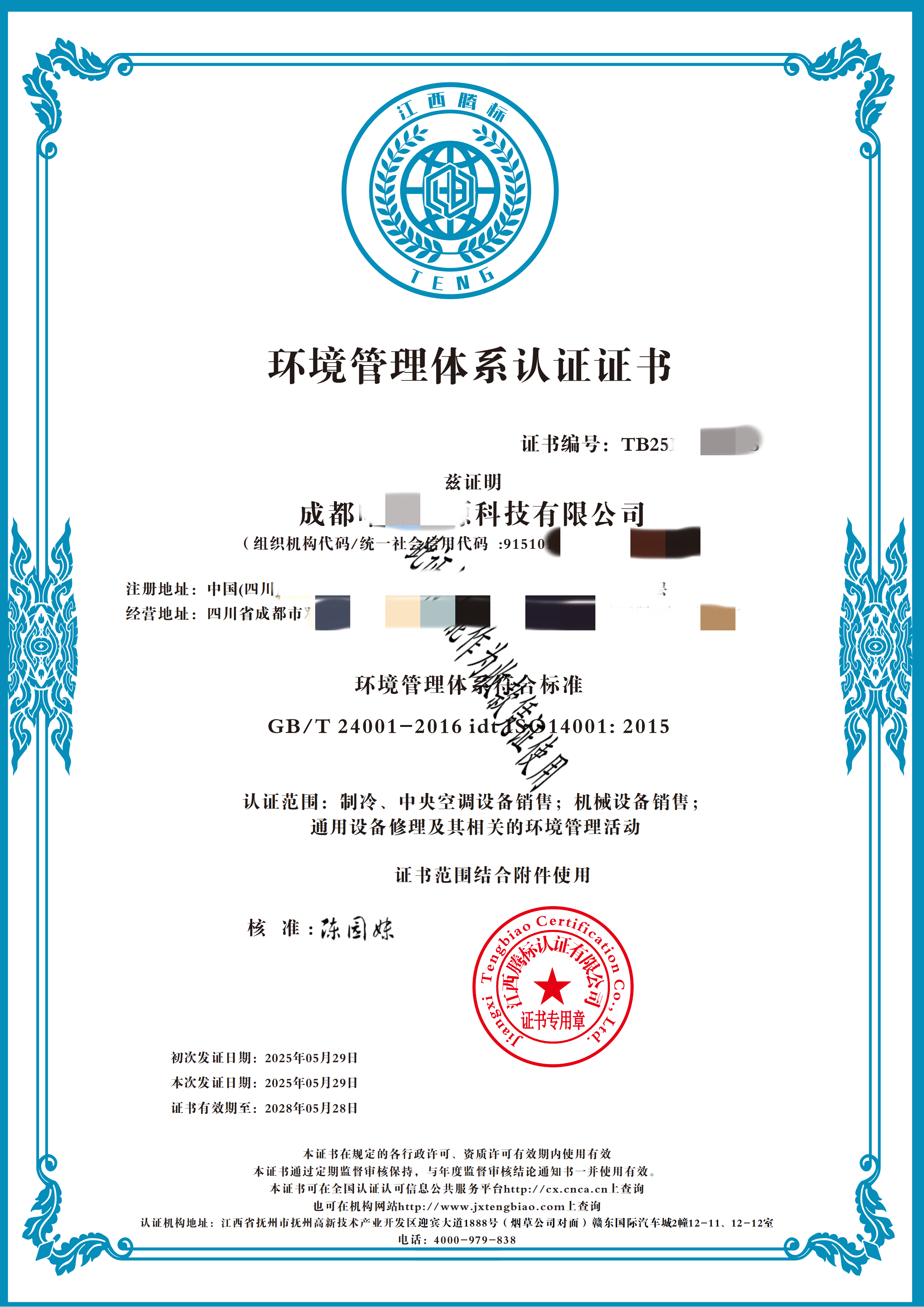 认证项目:环境管理体系认证证书
