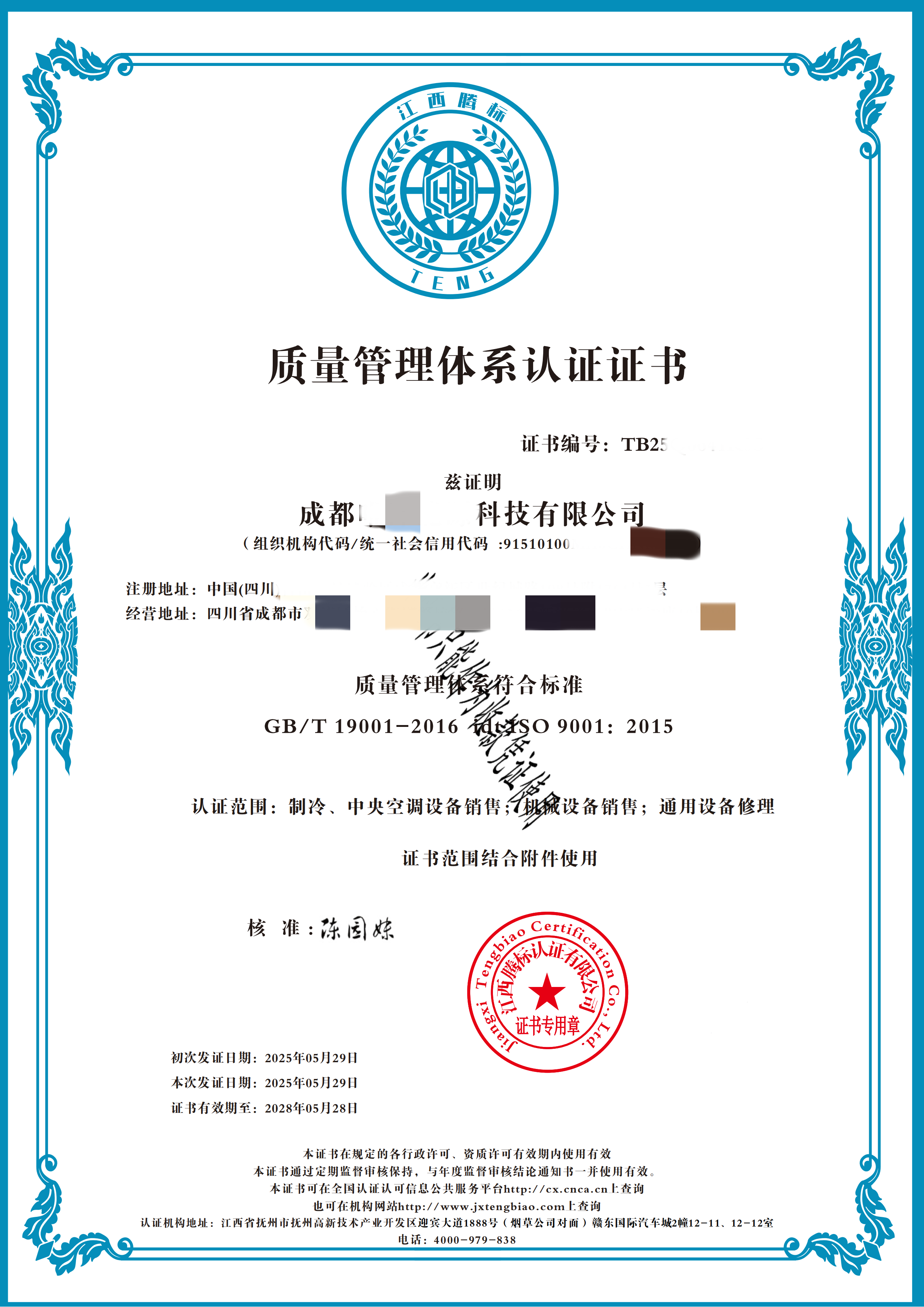恭喜成都唯洋能源科技有限公司 顺利通过体系审核,由国家认监委备案机构:江西腾标认证有限公司颁发的ISO三体系认证证书顺利下证