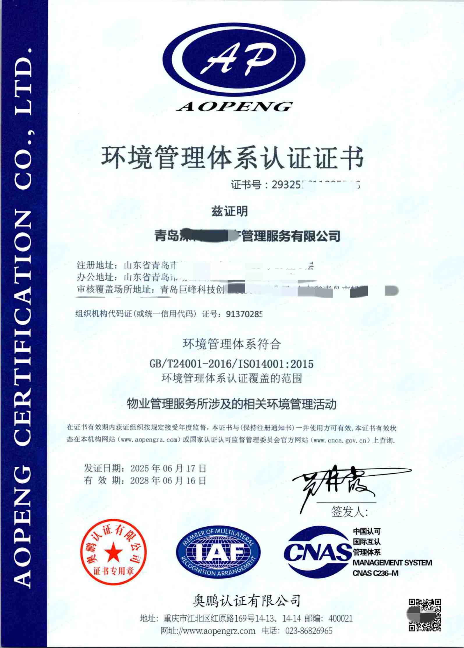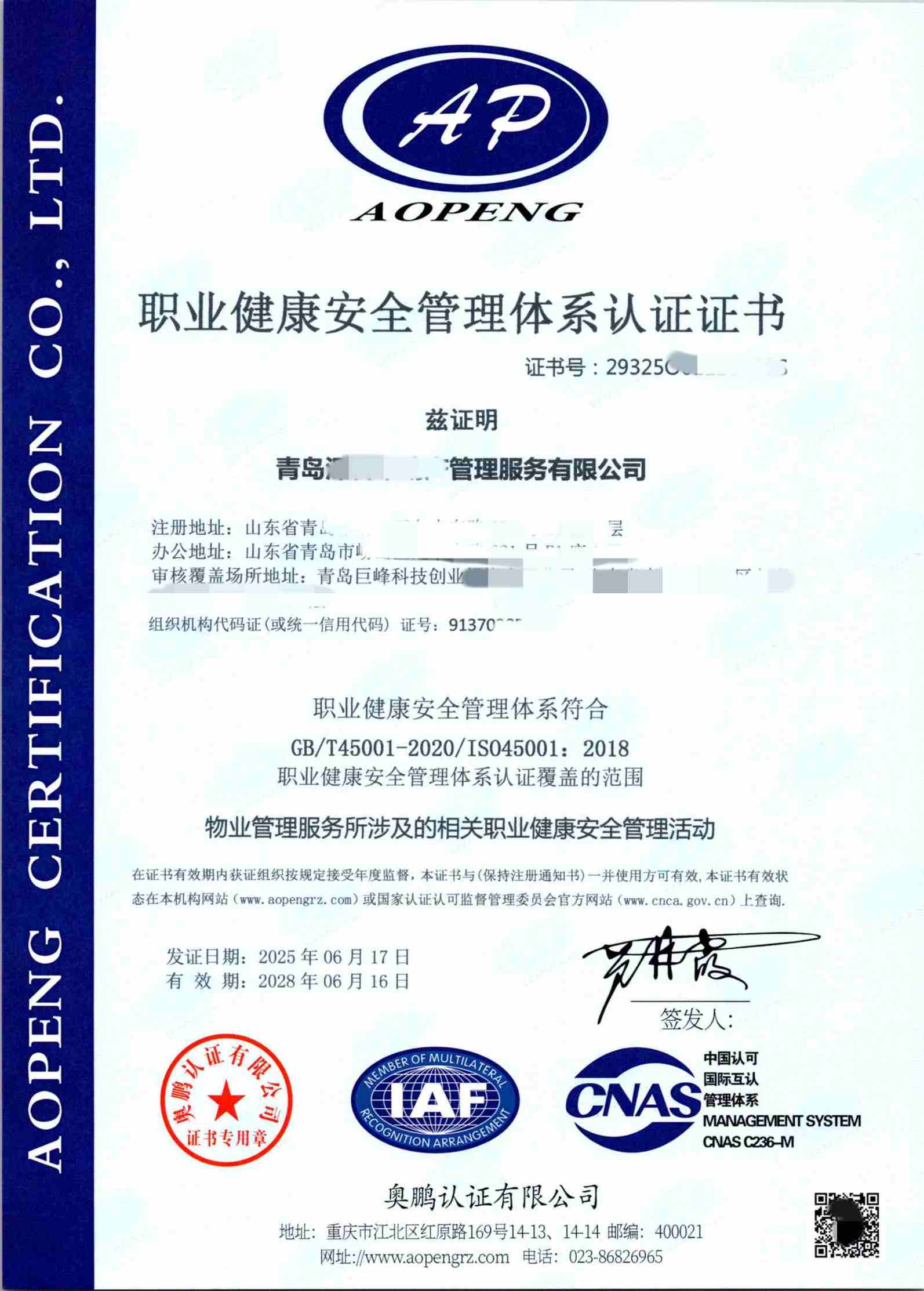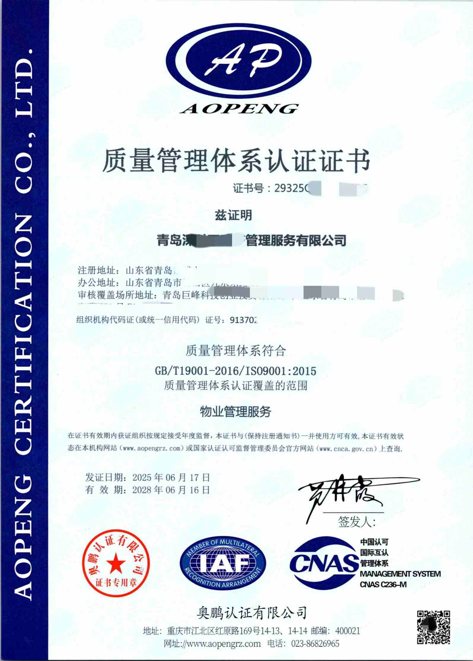 恭喜 青岛深科不动产管理服务有限公司 顺利通过体系审核,由国家认监委备案机构:奥鹏认证有限公司司颁发的ISO三体系认证证书顺利下证