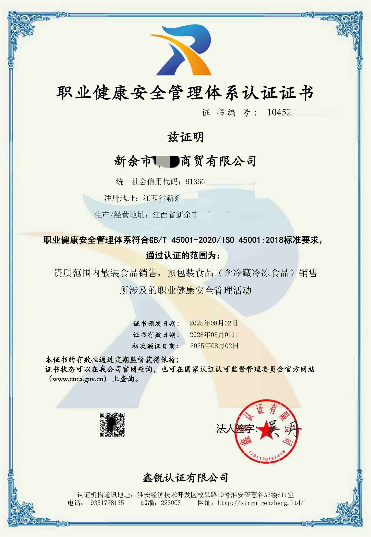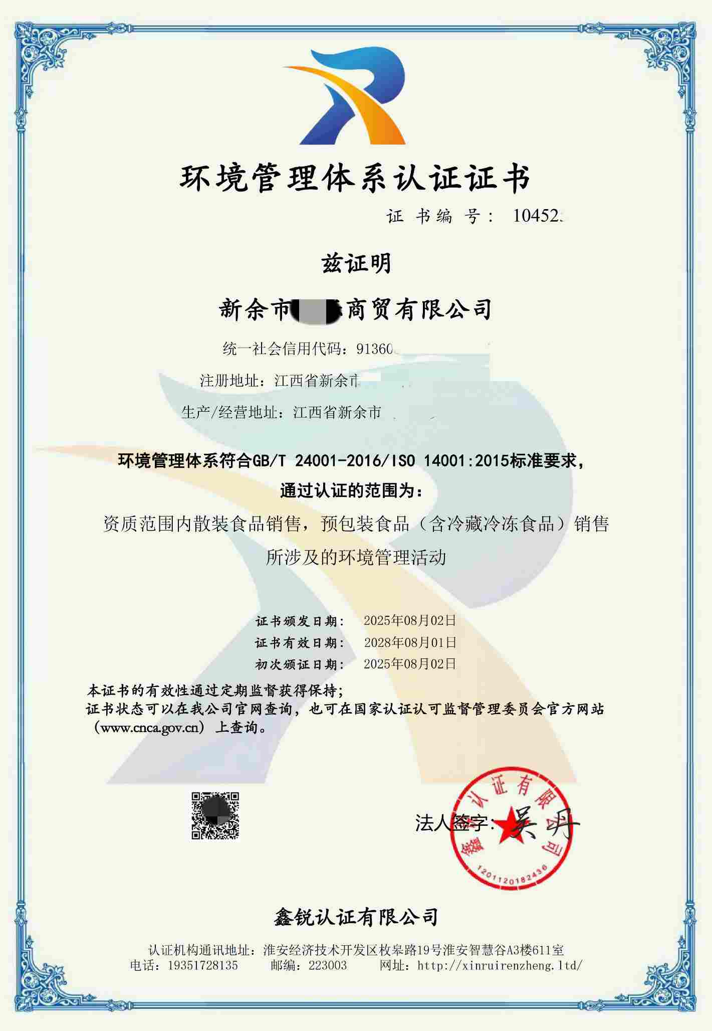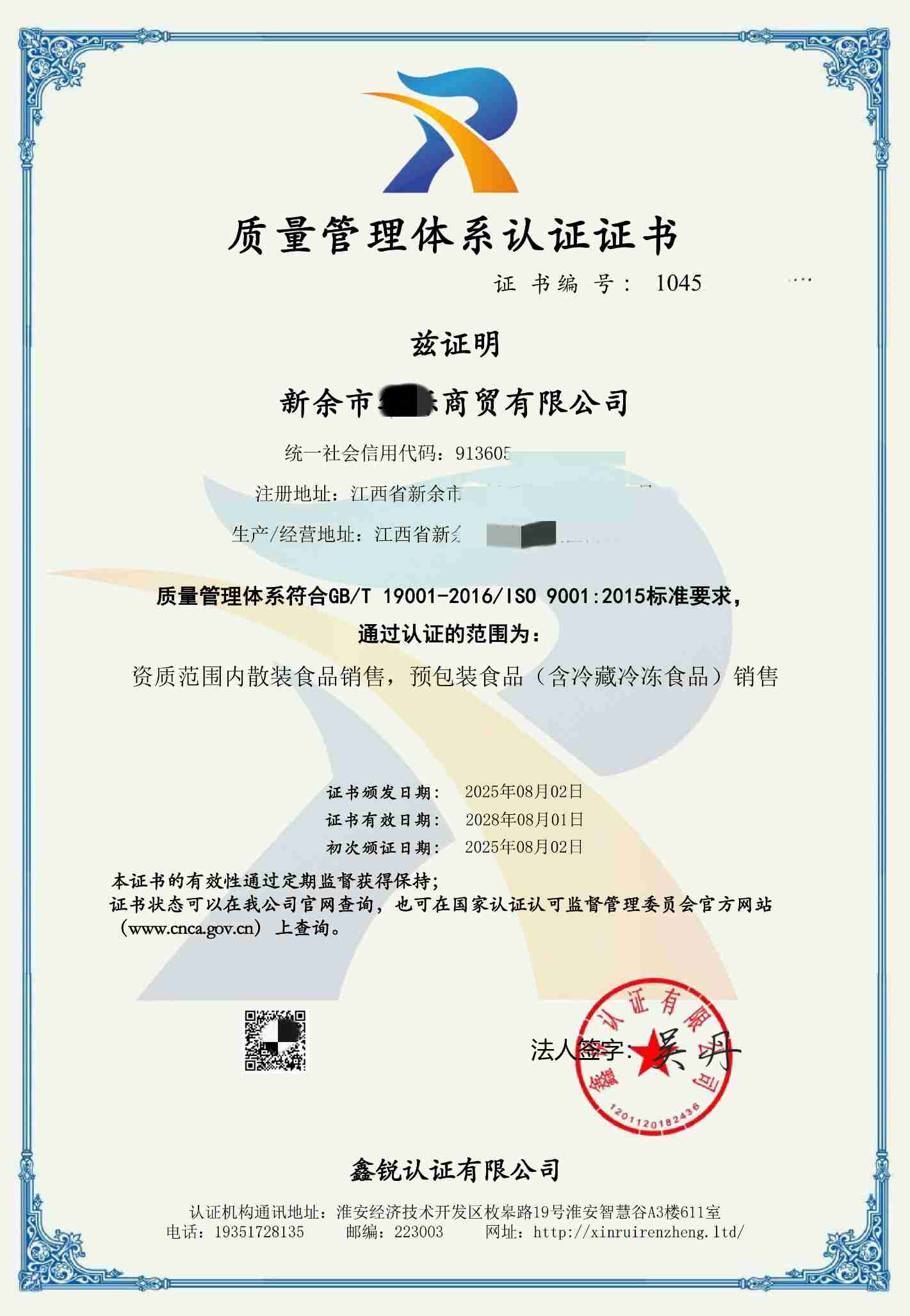 恭喜 新余市海意商贸有限公司顺利通过体系审核,由国家认监委备案机构:鑫锐认证有限公司颁发的ISO三体系认证证书顺利下证