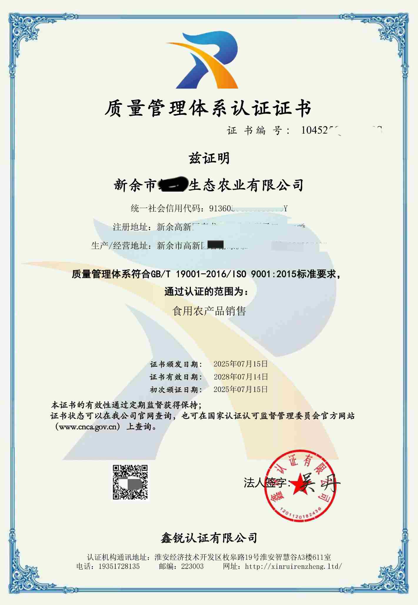恭喜 新余市绿博生态农业有限公司顺利通过体系审核,由国家认监委备案机构:鑫锐认证有限公司颁发的ISO三体系认证证书顺利下证