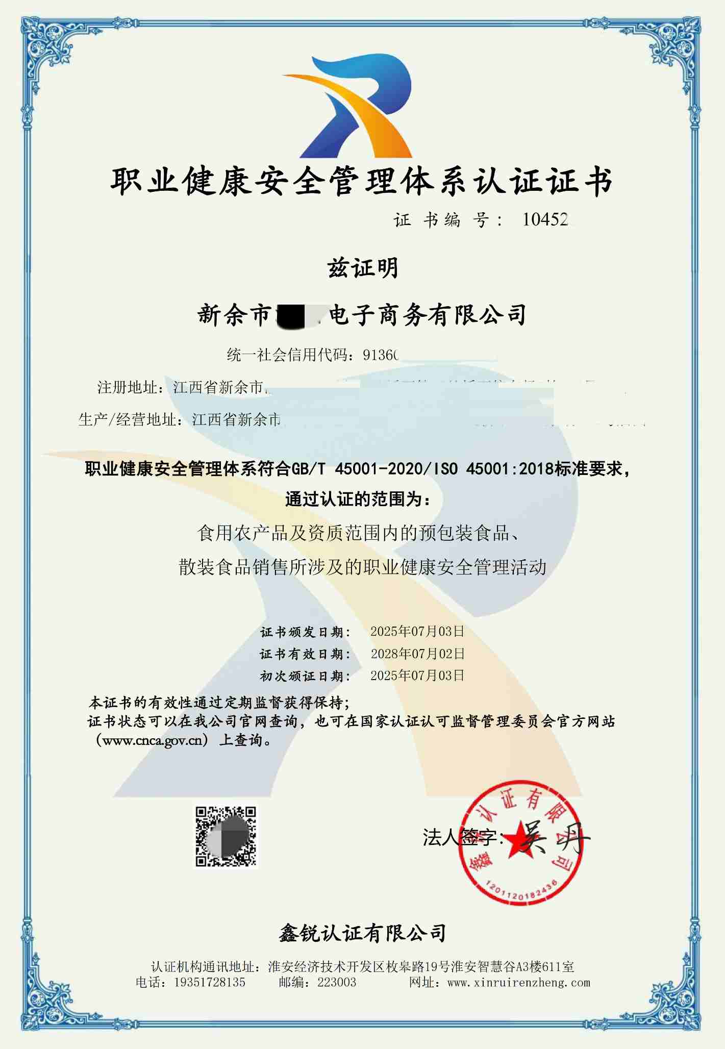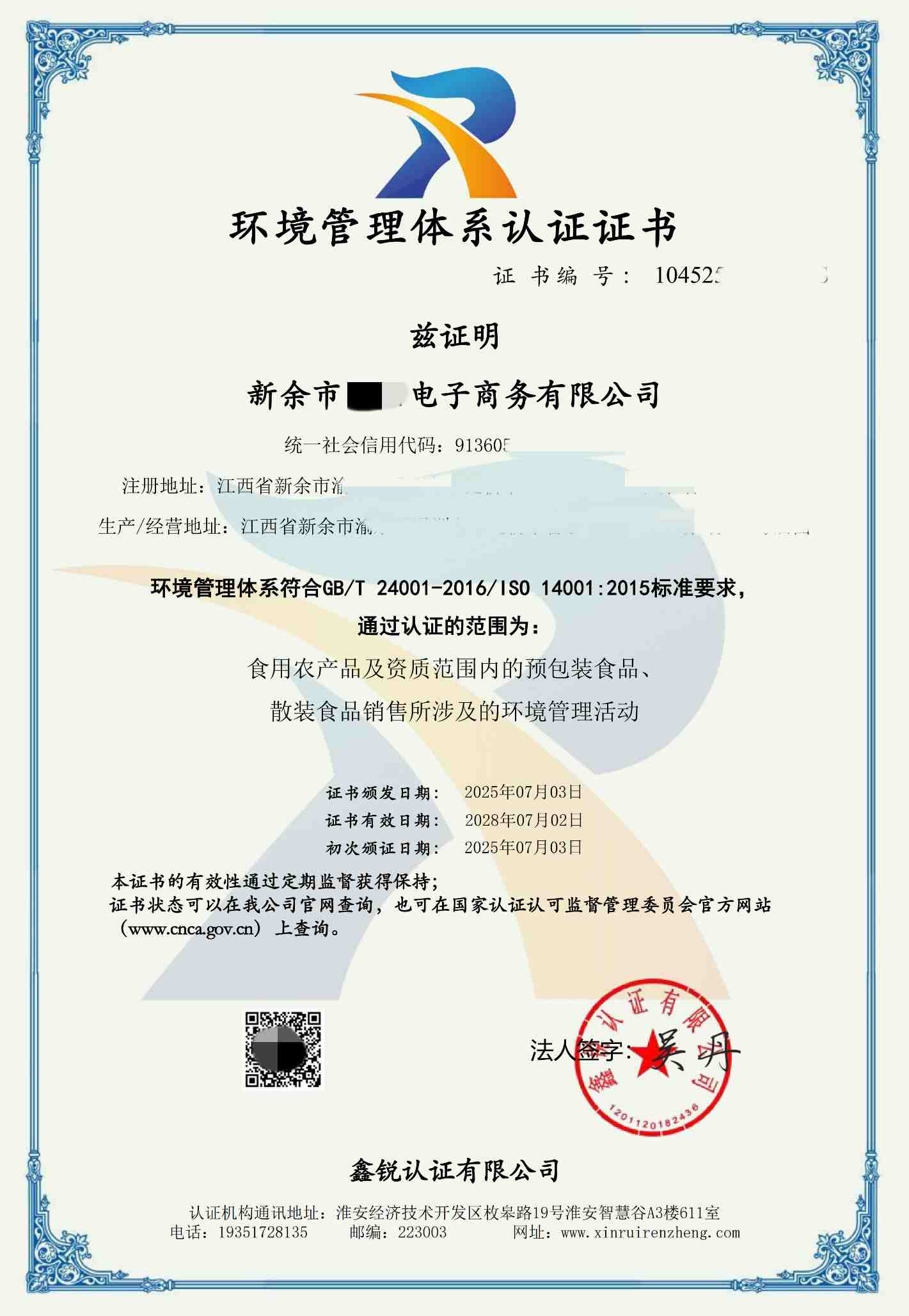 恭喜 新余市泓兴电子商务有限公司顺利通过体系审核,由国家认监委备案机构:鑫锐认证有限公司颁发的ISO三体系认证证书顺利下证
