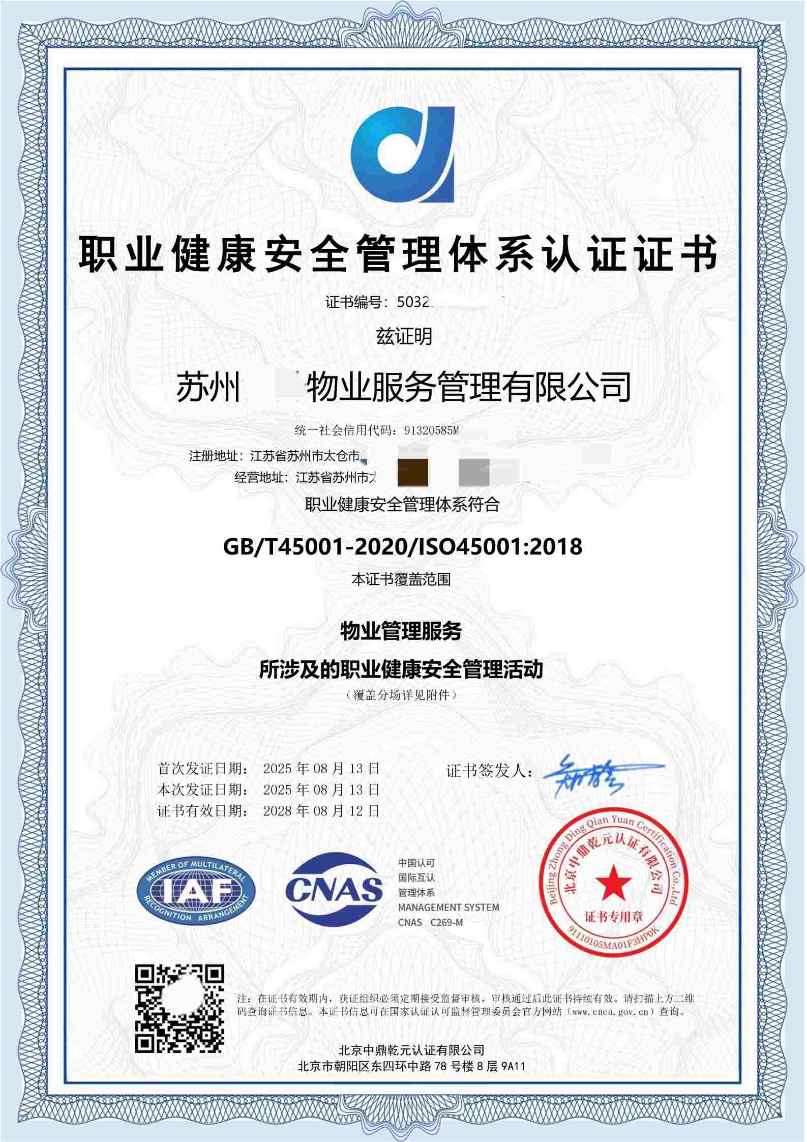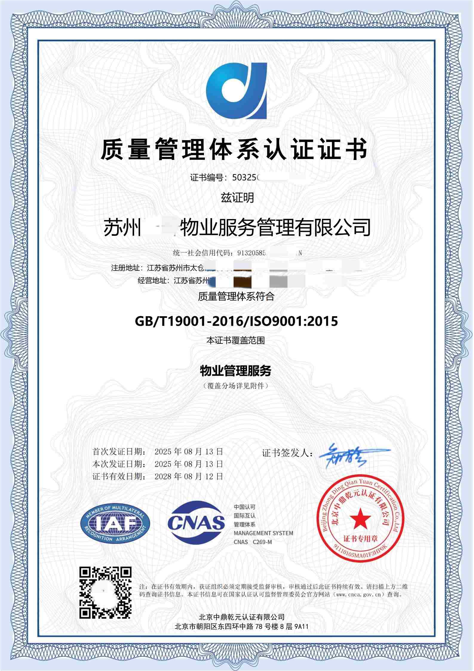 苏州锦升物业服务管理有限公司司办理ISO9001体系认证证书/AAA信用等级证书/商标/软件著作权/实用新型专利/人员证书/行业资质证书/两化融合贯标等项目认证均可联系我司办理