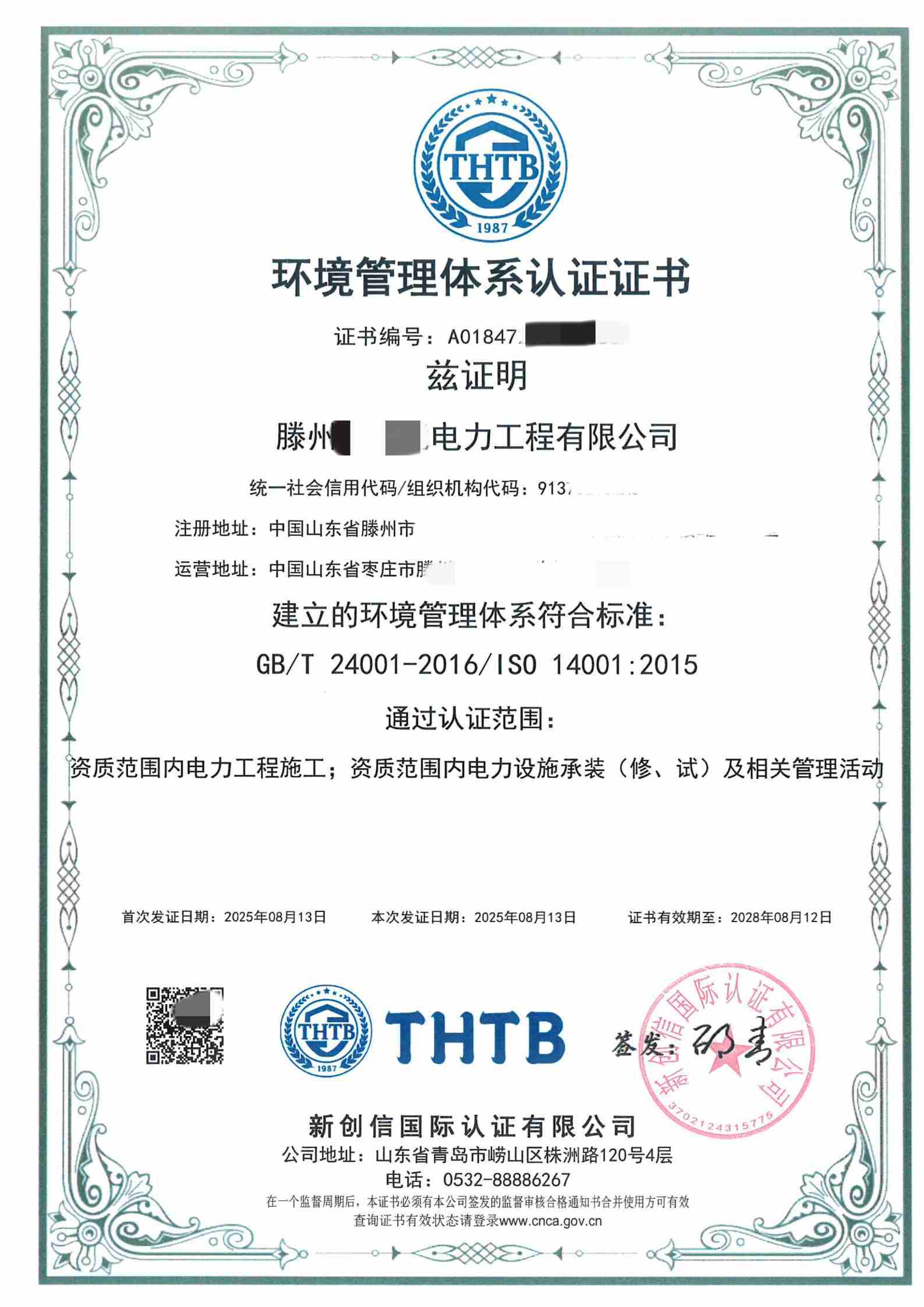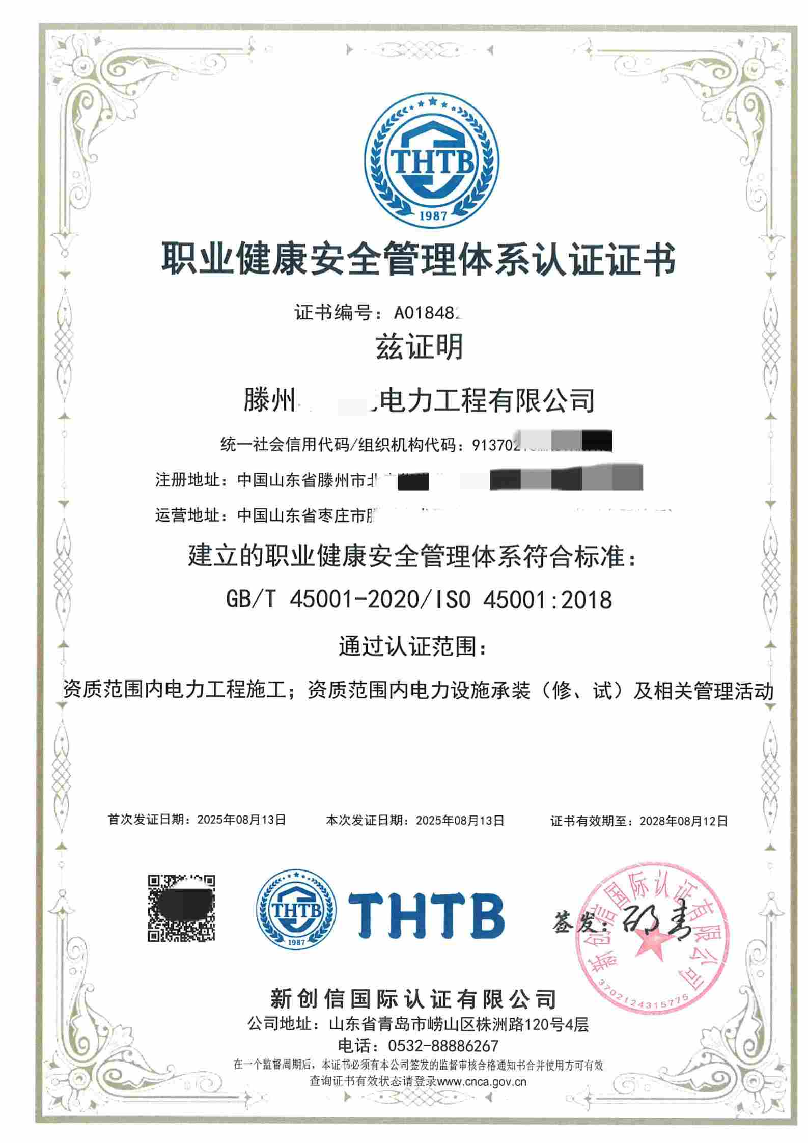 恭喜 滕州华之能电力工程有限公司顺利通过体系审核,由国家认监委备案机构:新创信国际认证有限公司颁发的ISO三体系认证证书顺利下证