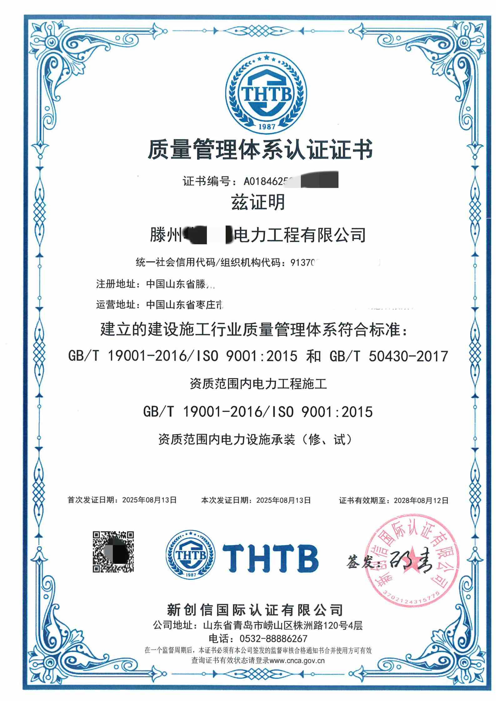 滕州华之能电力工程有限公司司办理ISO9001体系认证证书/AAA信用等级证书/商标/软件著作权/实用新型专利/人员证书/行业资质证书/两化融合贯标等项目认证均可联系我司办理