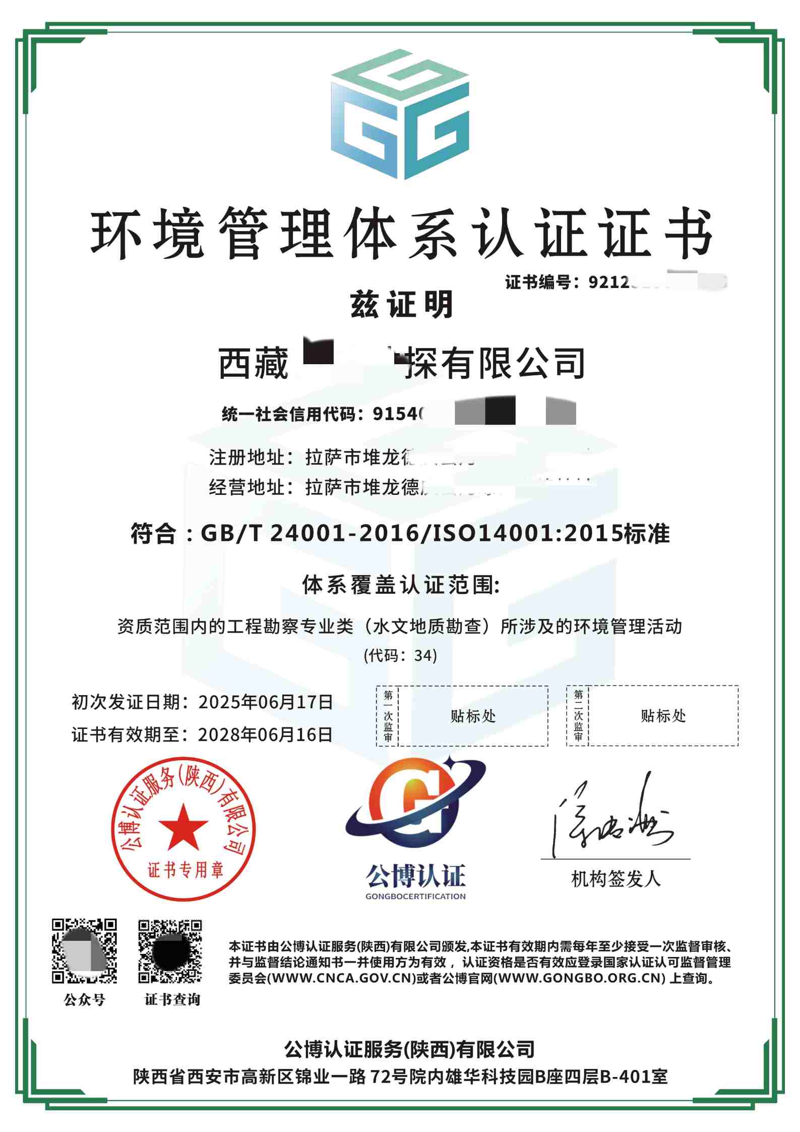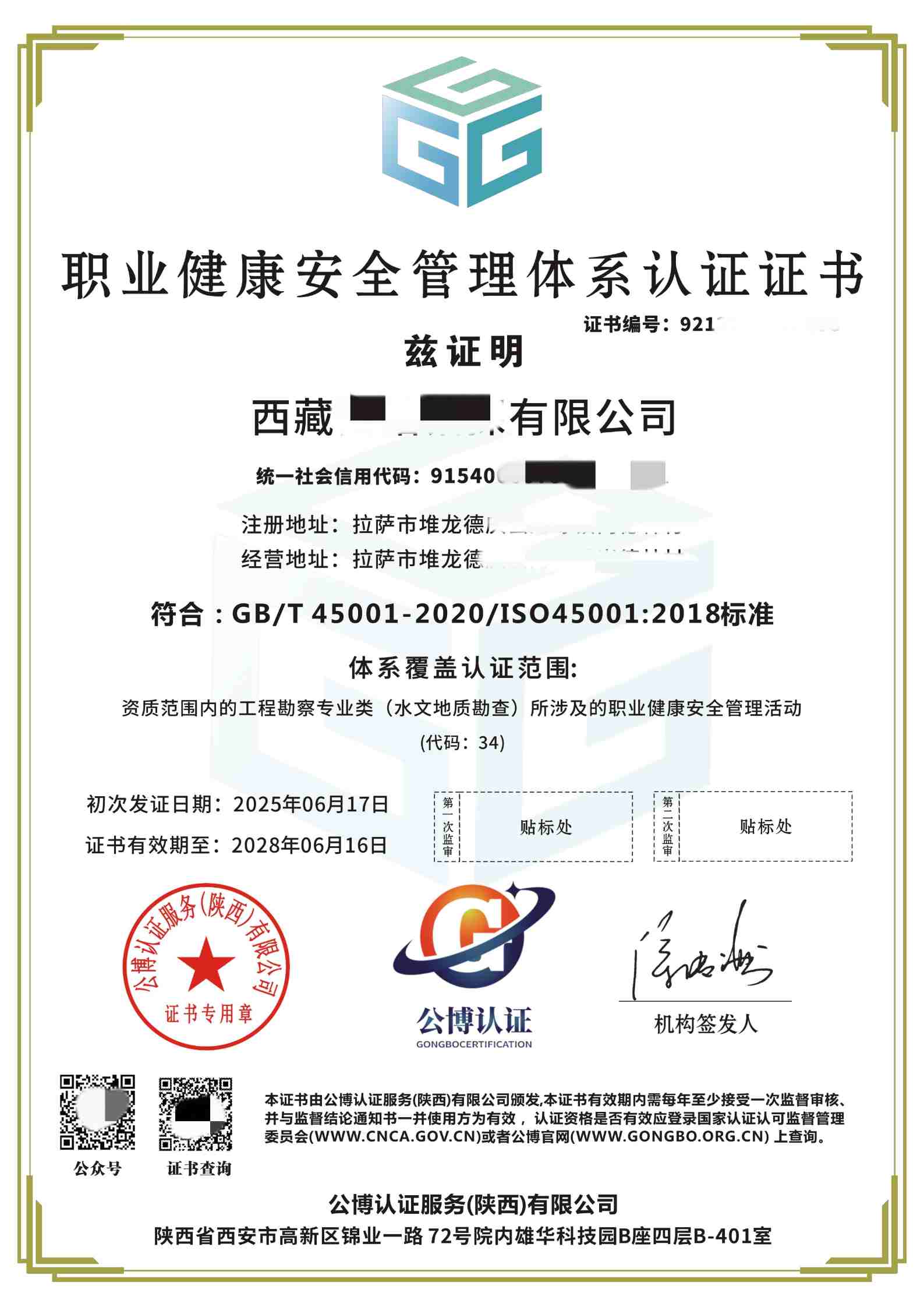 恭喜 西藏西钻钻探有限公司顺利通过体系审核,由国家认监委备案机构:公博认证服务(陕西)有限公司颁发的ISO三体系认证证书顺利下证