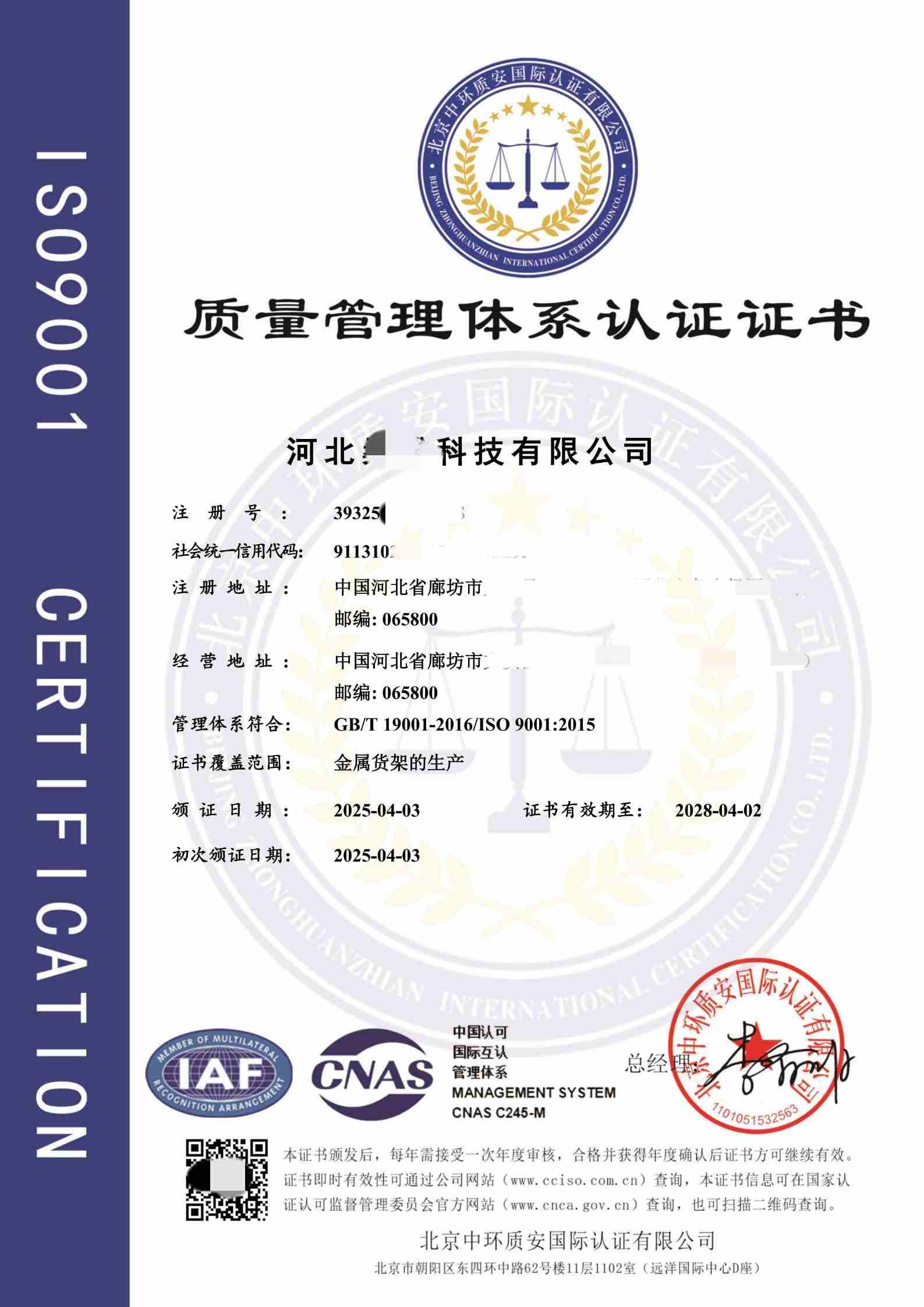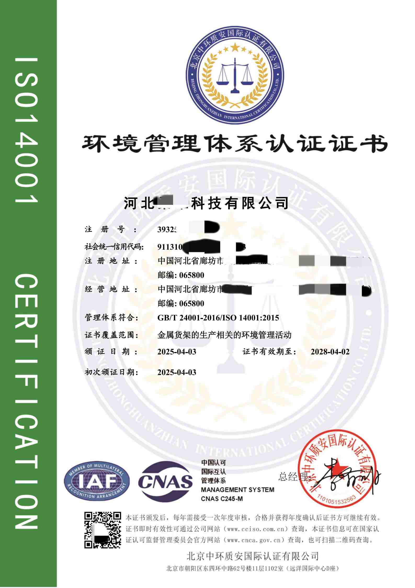 恭喜 河北桑雄科技有限公司顺利通过体系审核,由国家认监委备案机构:北京中环质安国际认证有限公司颁发的质量管理体系认证证书顺利下证