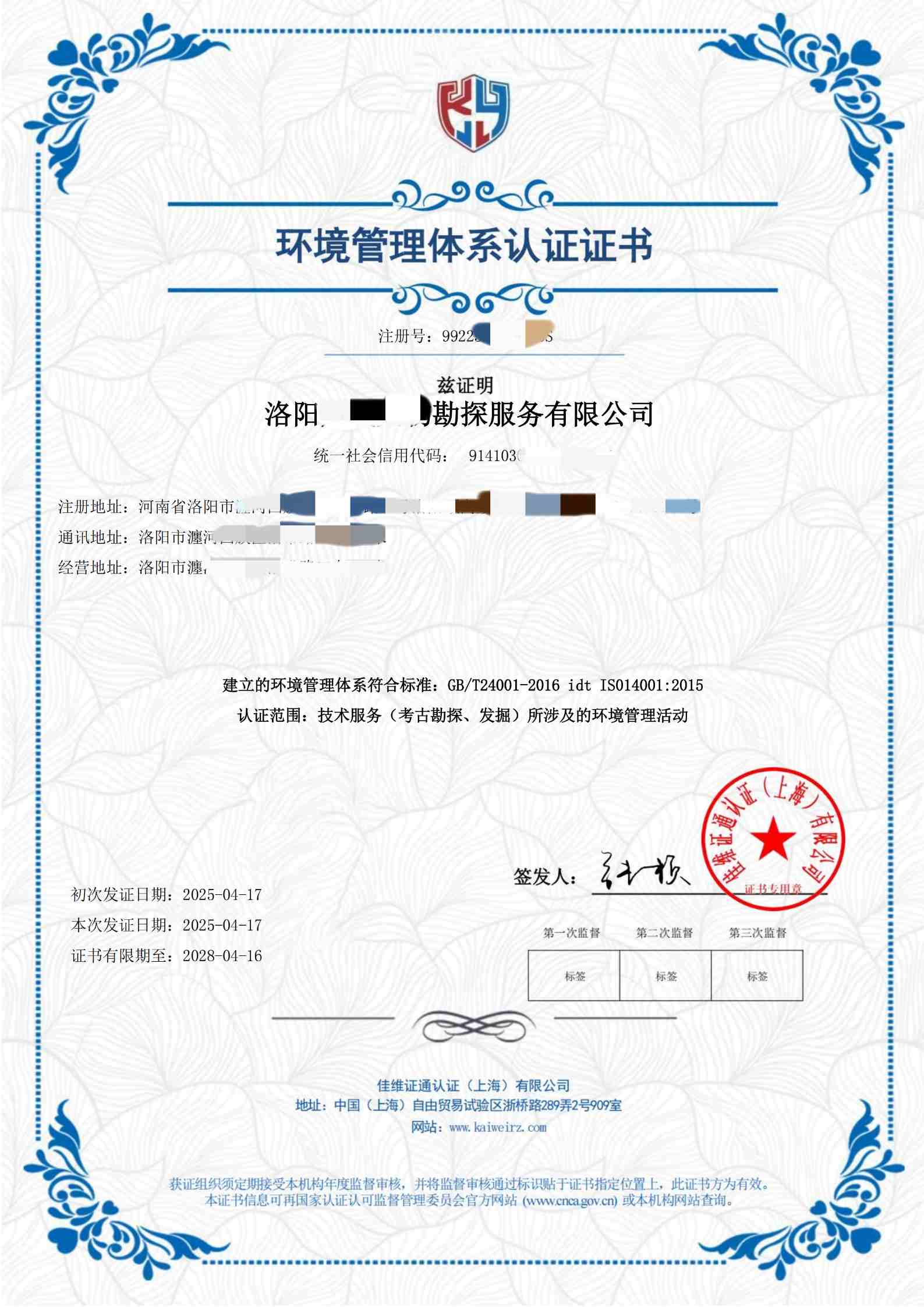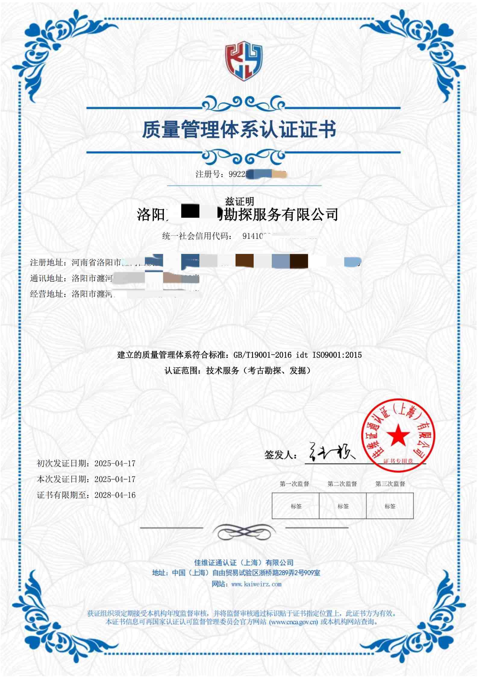 恭喜 洛阳万晟文物勘探服务有限公司顺利通过体系审核,由国家认监委备案机构:佳维认证(江苏)有限公司颁发的质量管理体系认证证书顺利下证